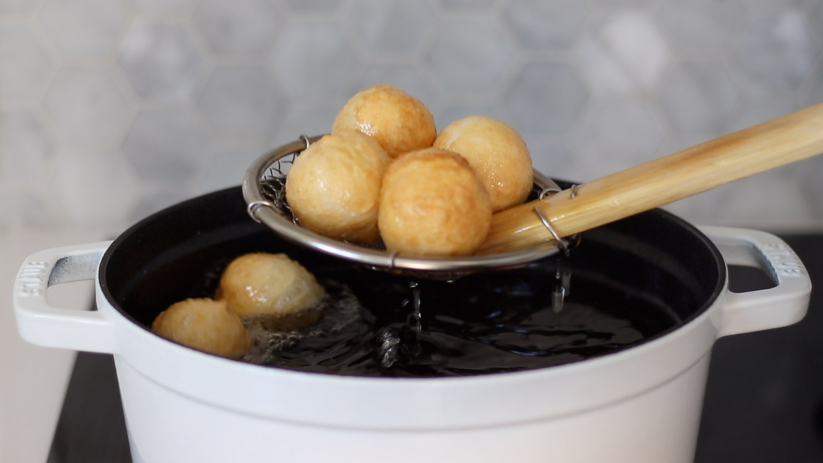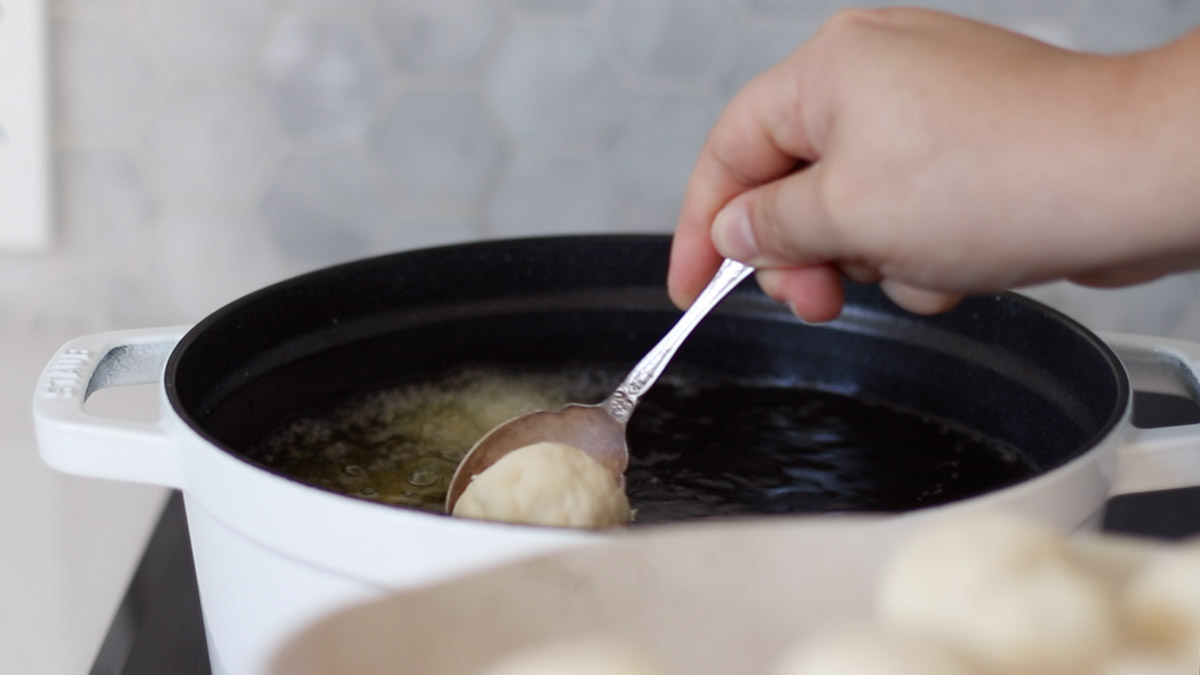 Using a small spoon or your hands break off about 1 Tbsp sized pieces of the donut dough and roll between your hands to form a ball. Use extra flour if the dough is sticking.
